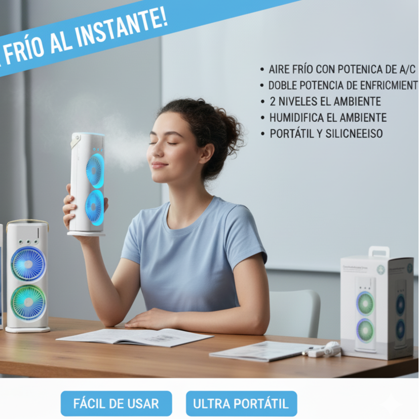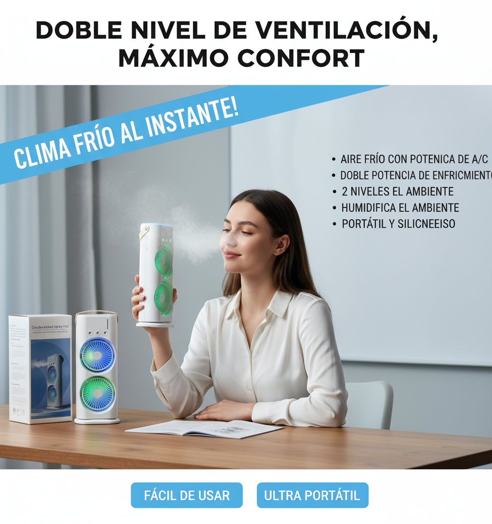 👉 Sí, funciona como ventilador normal, pero con agua activa el spray humidificador.